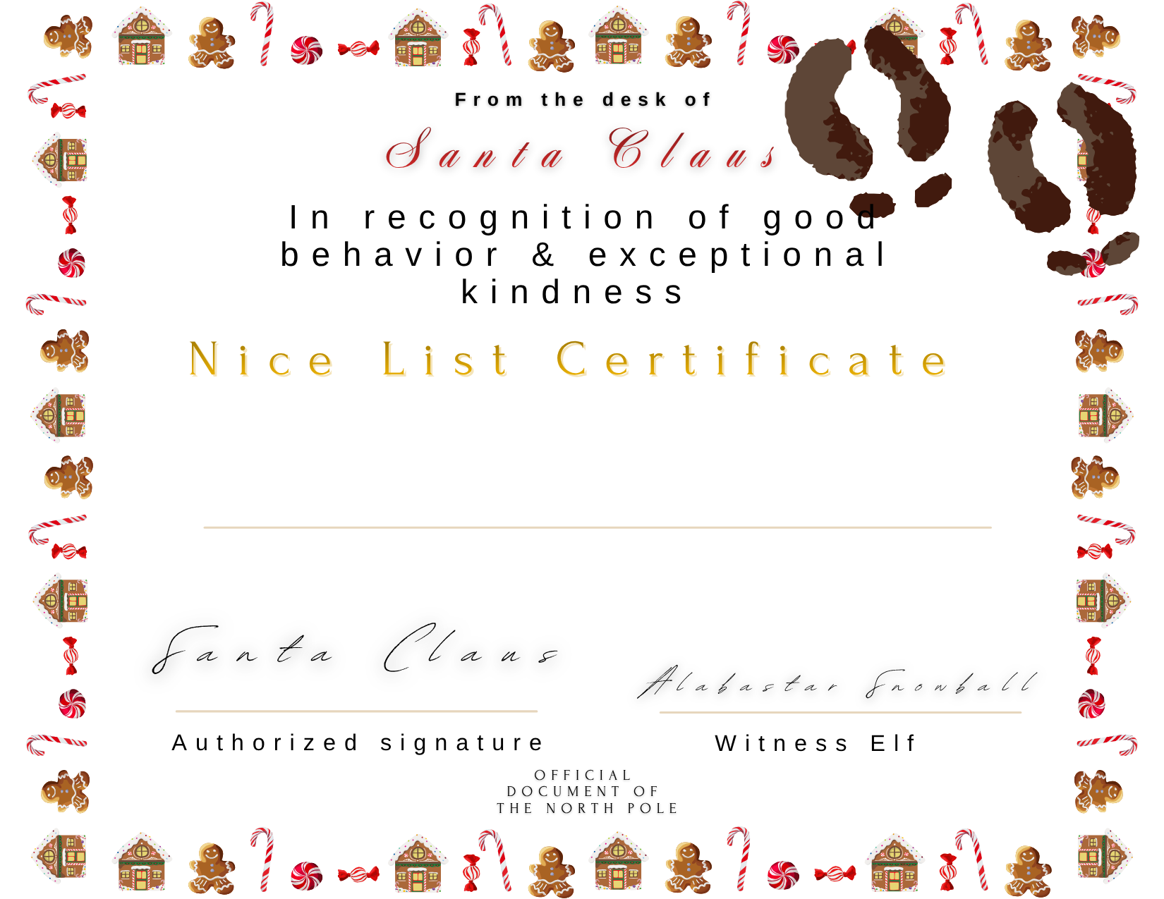 - An Official "Nice List " Certificate, personalized with your child's name, embossed with a golden seal, and Reindeer stamp of approval.